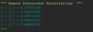 1 from math import * 2 def func(x): 3 m = 0 4 s = 2 5 fst = 1/(((2*pi)**0.5)*s) 6 sed = exp((-0.5)*((x-m)/s)**2) 7 return fst*sed 8 9 print(f'x = 1,f = {func(1):.8f}') 10 print(f'x = 3,f = {func(3):.8f}') 11 print(f'x = 5,f = {func(5):.8f}') 12 print(f'x = 7,f = {func(7):.8f}') 13 print(f'x = 9,f = {func(9):.8f}')