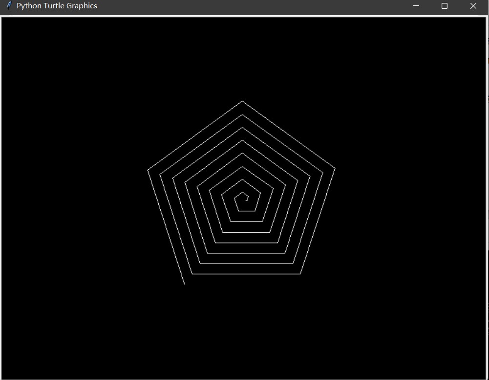 # 绘制螺旋状正方形、五边形 from turtle import * help(circle) setup(800,600) bgcolor('black') pencolor('white') speed(0) angle = 0 size = 2 n=10 for i in range(n): for j in range(4): fd(size) angle += 360/5 seth(angle) size += 5 hideturtle() done()