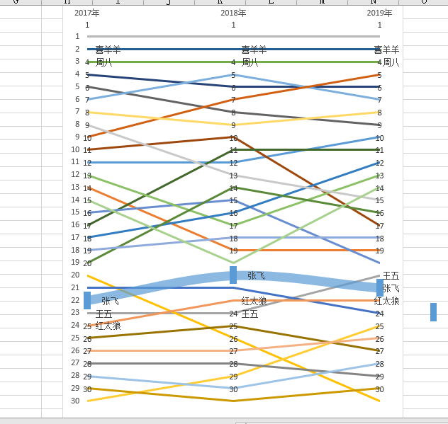 首先准备好需要绘制排名变化情况的数据,图中各数值为对应人在对应年份的排名。