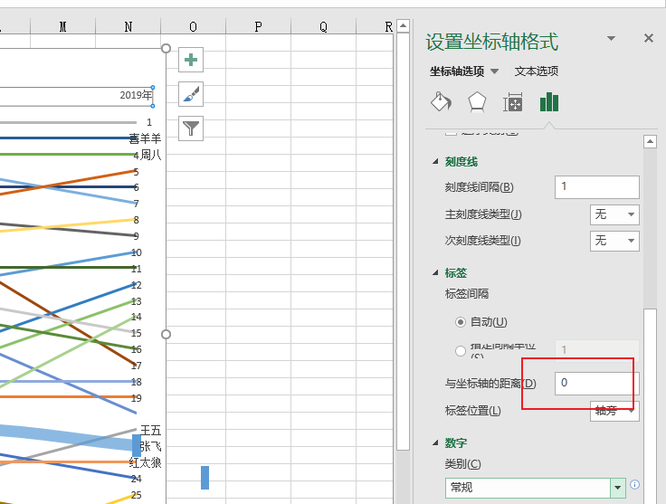 接着,横坐标的文本选项中设置坐标位置为“刻度线上”就可以消除排名数字与曲线之间的空隙了。