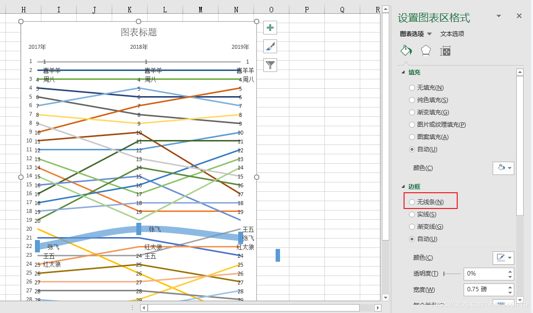 接下来来美化一下横坐标吧,双击年份坐标,将坐标的线条选择为“无线条”,这样就可以隐藏横轴了~