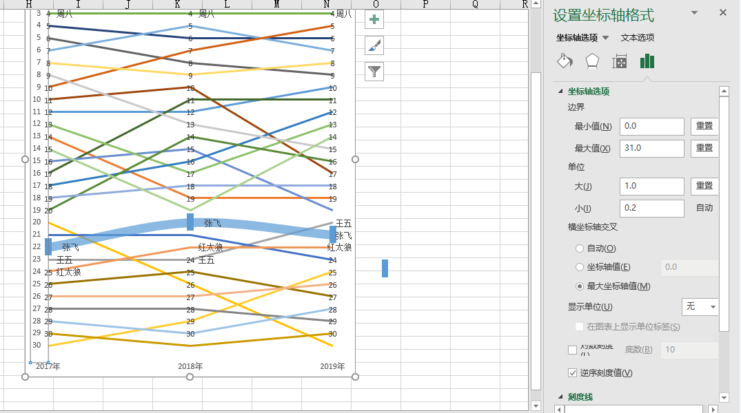 双击纵轴坐标,将边界最大值,最小值分别调整为31和0(这里我们只有30个人排序,上下两端各预留一个数的位置,这样做的目的是防止折线比较粗时超出绘图区域而被裁掉),单位设定为1,这样每个排名多会有对应的刻度。最后勾选“逆序刻度值”就可以了。