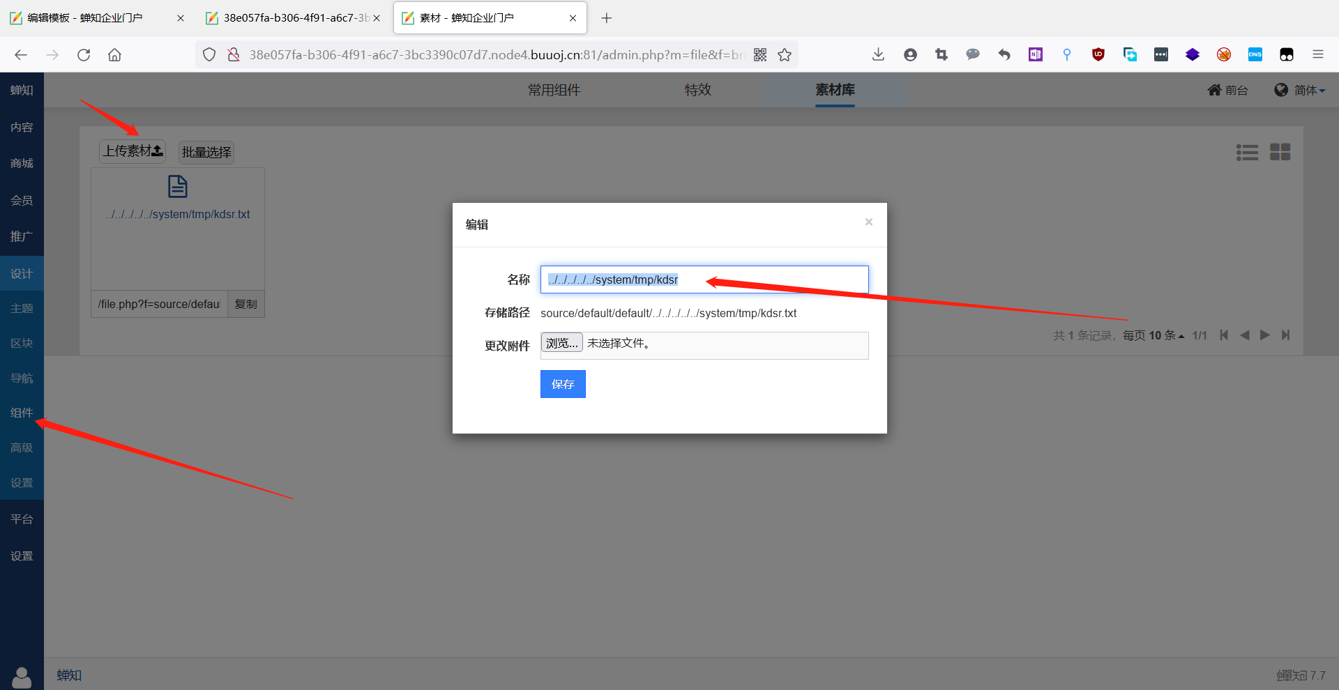 上传组件素材的地方通过修改名称可导致目录穿越创建文件至system目录