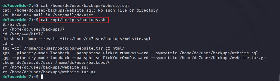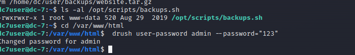 对于当前的dc7user用户来说没有写权限,如果想再该脚本中写入代码,需要是root用户或者属于www-data组。因此还是需要从网站入手,拿到www-data用户权限。