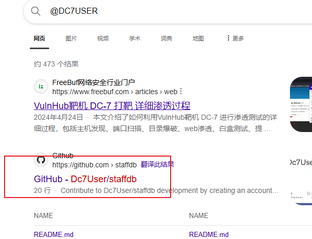 - 靶机的信息告诉我们跳出思维惯性,页面的最先面有一个@DC7USER,既然是@开头,大概率是某个账号信息。所以尝试去谷歌或者github搜索@DC7USER。