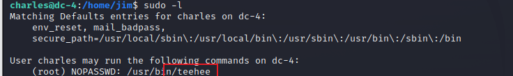 sudo -l查看用户的权限,根据显示可以利用teehee提权