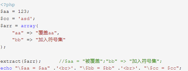 所以可以利用 extract 函数将这些数组导入当前符号集,也就是说直接使用他的键值对作为当前的变量