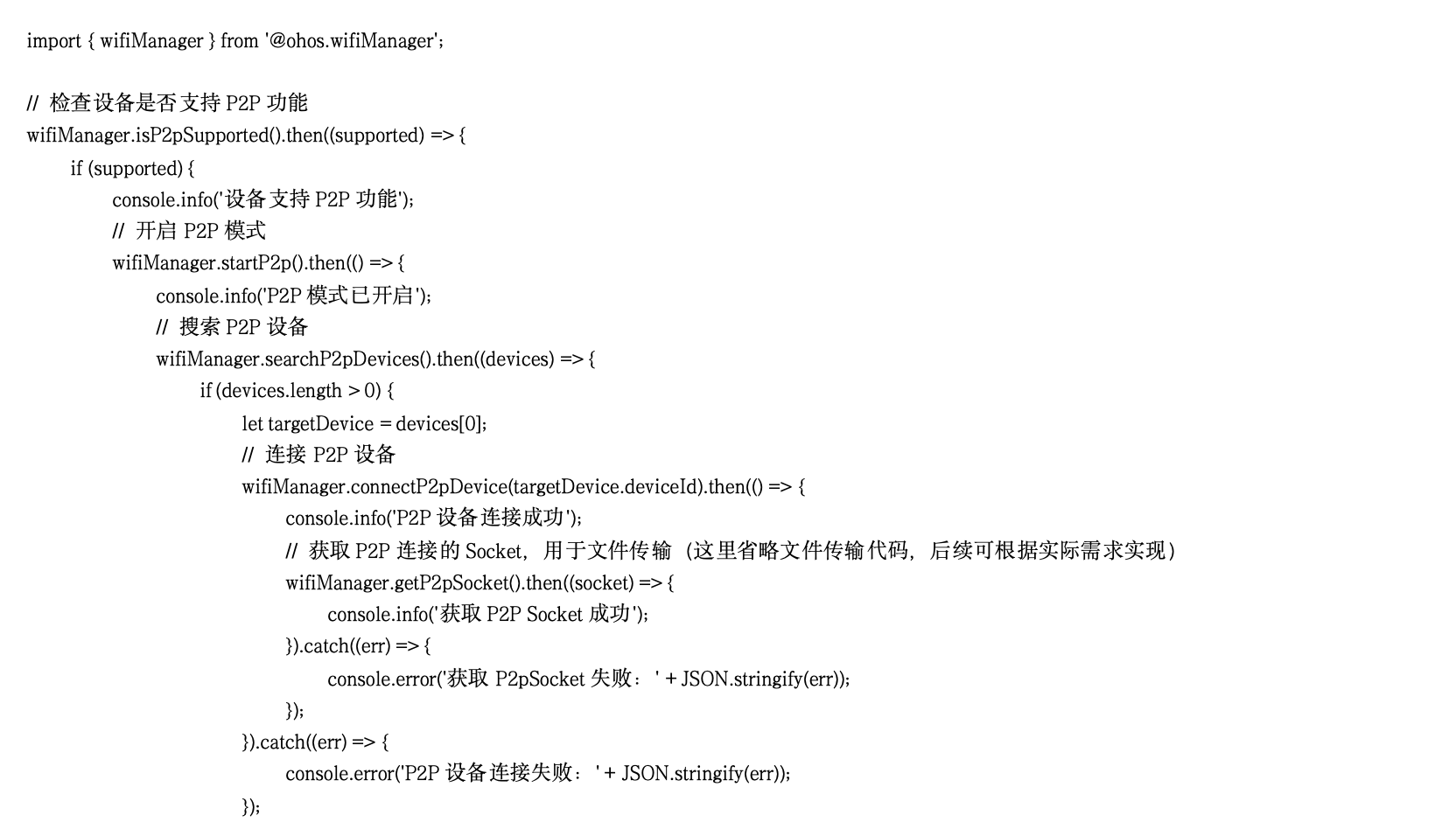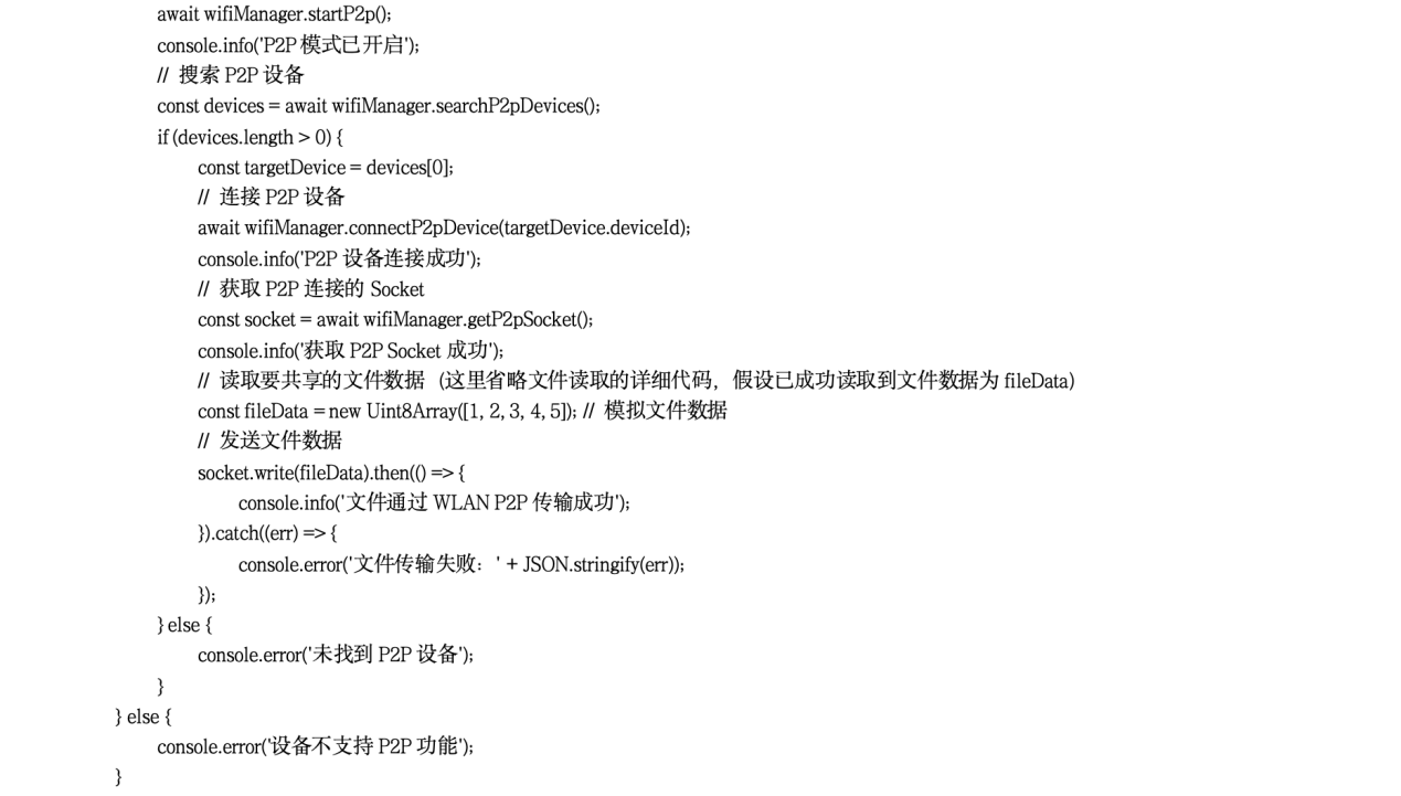 · 首先,需要在设备上配置WLAN P2P模式以创建文件共享网络。以下是一个简单的示例代码: