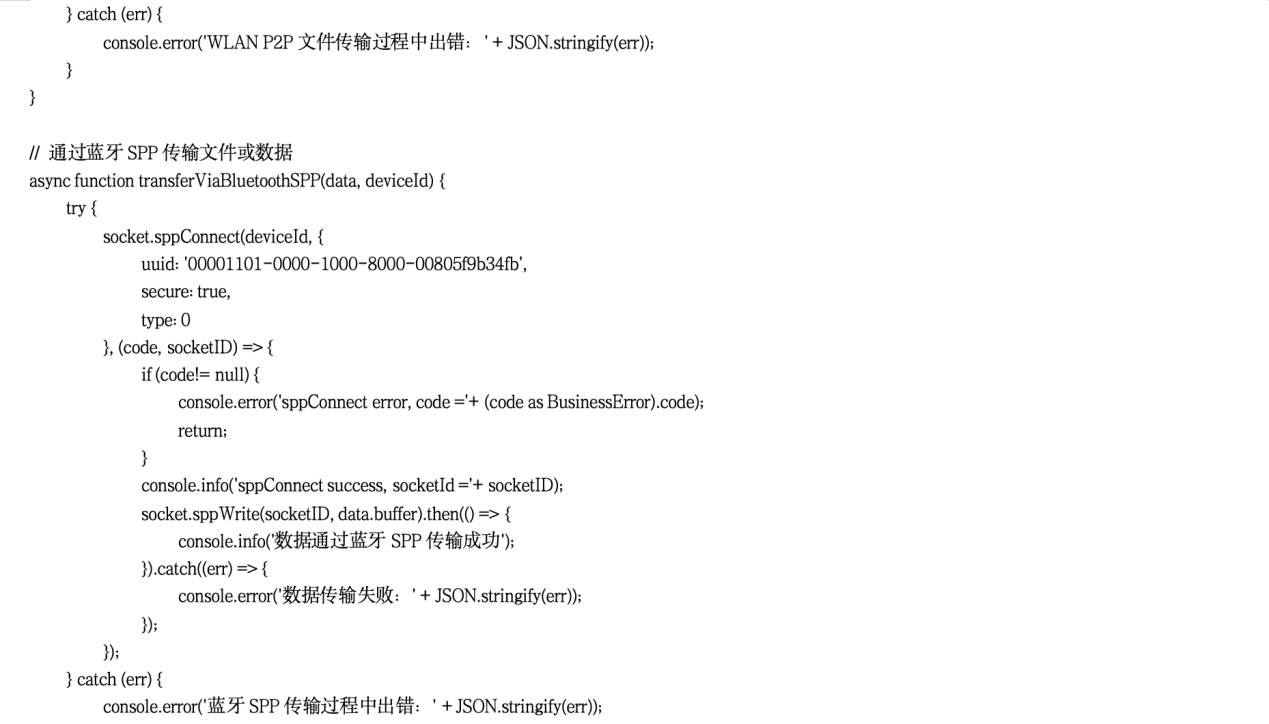 · 在实际应用中,需要根据文件大小和传输需求合理选择使用WLAN P2P或蓝牙SPP。例如,当用户选择传输一个大型视频文件时,系统自动启动WLAN P2P连接进行传输;而当传输一个简短的会议纪要文档或即时消息时,则使用蓝牙SPP。同时,在设备状态同步方面,可以利用蓝牙SPP的低功耗和快速连接特性,实时更新设备的状态信息,如文件传输进度、设备电量等,以便用户更好地掌握文件共享过程。