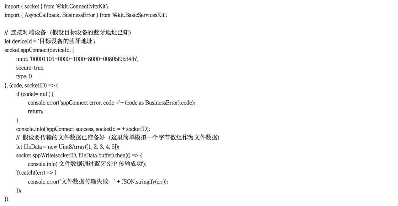 · 对于蓝牙SPP的应用,首先要确保设备的蓝牙功能已开启,然后按照以下步骤进行操作。以下是蓝牙SPP文件传输的示例代码: