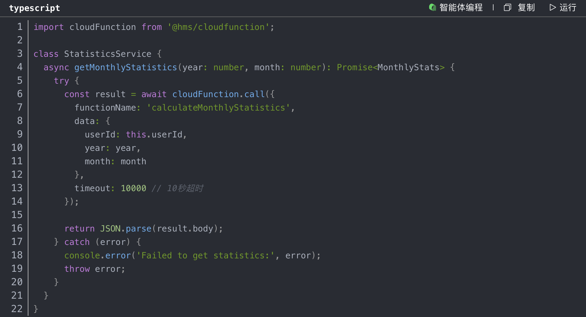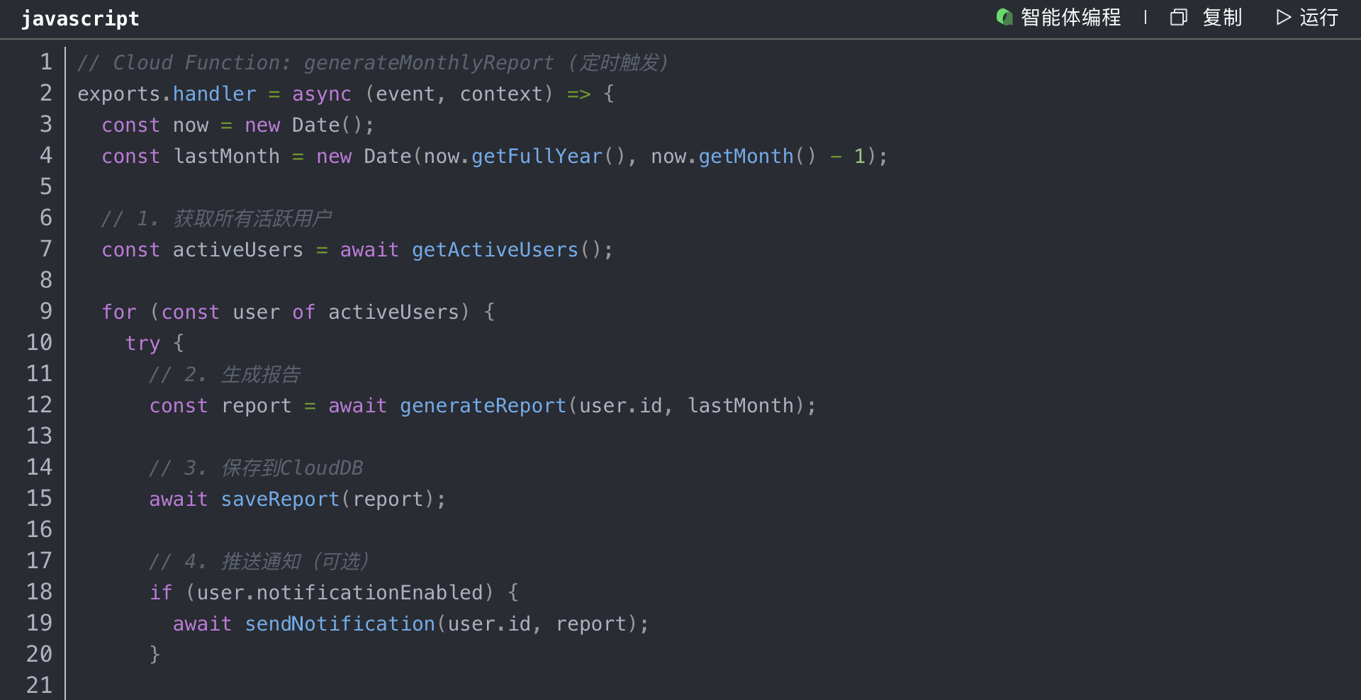 虽然CloudDB强大,但复杂的统计查询放在客户端执行会消耗大量性能。我们使用Cloud Functions在服务端进行统计。