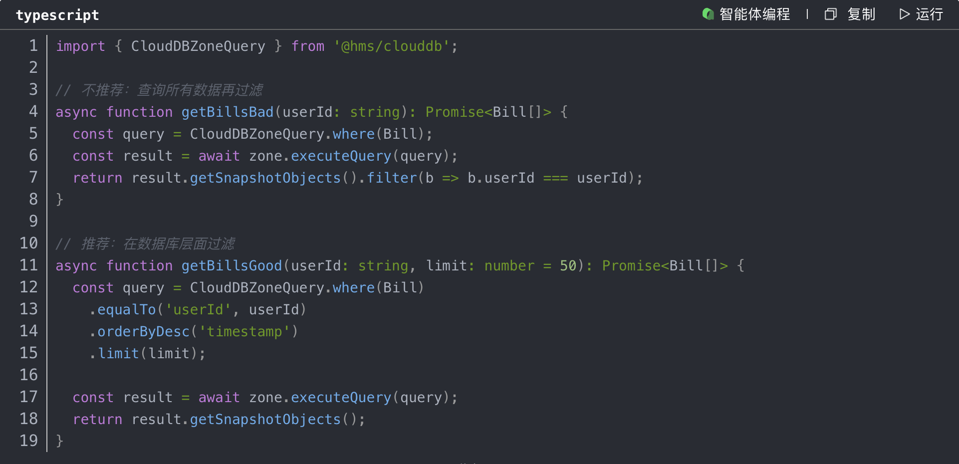 CloudDB支持类SQL的查询语法,但需要注意查询优化: