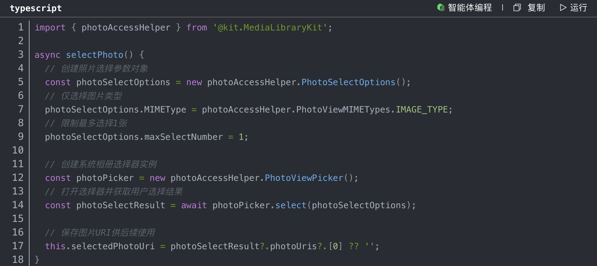 HarmonyOS提供了PhotoViewPicker选择器,可便捷地从相册选择或拍照获取图片: