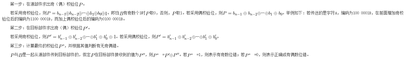 最简单的数据校验方法是奇偶校验。实现原理如下:假设将数据B=bn-1bn-2...b1b0从源部件传送至目标部件。在目标部件接收到的数据为B'=b'n-1b'n-2...b1b0.为了判断数据
