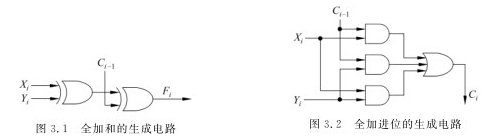 (2)第i位的加法运算是指第i位的加数Xi,Yi和低位来的进位Ci-1三者相加,得到本位和Fi和第i位的进位输出Ci。