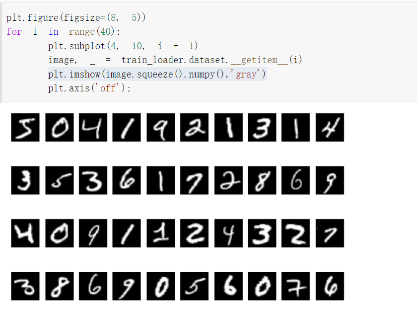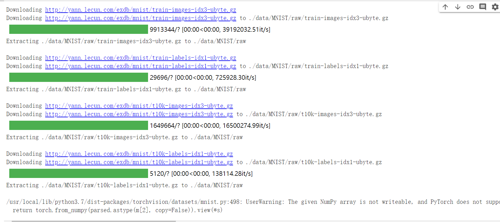 1 input_size = 28*28 # MNIST上的图像尺寸是 28x28 2 output_size = 10 # 类别为 0 到 9 的数字,因此为十类 3 4 train_loader = torch.utils.data.DataLoader( 5 datasets.MNIST('./data', train=True, download=True, 6 transform=transforms.Compose( 7 [transforms.ToTensor(), 8 transforms.Normalize((0.1307,), (0.3081,))])), 9 batch_size=64, shuffle=True) 10 11 test_loader = torch.utils.data.DataLoader( 12 datasets.MNIST('./data', train=False, transform=transforms.Compose([ 13 transforms.ToTensor(), 14 transforms.Normalize((0.1307,), (0.3081,))])), 15 batch_size=1000, shuffle=True)