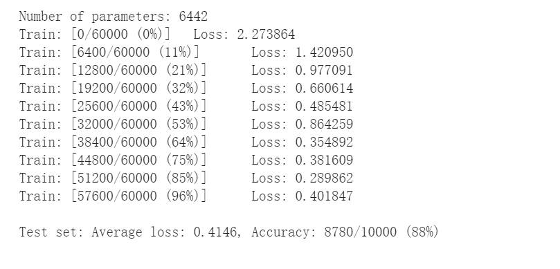 1 def train(model): 2 model.train() 3 # 主里从train_loader里,64个样本一个batch为单位提取样本进行训练 4 for batch_idx, (data, target) in enumerate(train_loader): 5 # 把数据送到GPU中 6 data, target = data.to(device), target.to(device) 7 8 optimizer.zero_grad() 9 output = model(data) 10 loss = F.nll_loss(output, target) 11 loss.backward() 12 optimizer.step() 13 if batch_idx % 100 == 0: 14 print('Train: [{}/{} ({:.0f}%)]\tLoss: {:.6f}'.format( 15 batch_idx * len(data), len(train_loader.dataset), 16 100. * batch_idx / len(train_loader), loss.item())) 17 18 19 def test(model): 20 model.eval() 21 test_loss = 0 22 correct = 0 23 for data, target in test_loader: 24 # 把数据送到GPU中 25 data, target = data.to(device), target.to(device) 26 # 把数据送入模型,得到预测结果 27 output = model(data) 28 # 计算本次batch的损失,并加到 test_loss 中 29 test_loss += F.nll_loss(output, target, reduction='sum').item() 30 # get the index of the max log-probability,最后一层输出10个数, 31 # 值最大的那个即对应着分类结果,然后把分类结果保存在 pred 里 32 pred = output.data.max(1, keepdim=True)[1] 33 # 将 pred 与 target 相比,得到正确预测结果的数量,并加到 correct 中 34 # 这里需要注意一下 view_as ,意思是把 target 变成维度和 pred 一样的意思 35 correct += pred.eq(target.data.view_as(pred)).cpu().sum().item() 36 37 test_loss /= len(test_loader.dataset) 38 accuracy = 100. * correct / len(test_loader.dataset) 39 print('\nTest set: Average loss: {:.4f}, Accuracy: {}/{} ({:.0f}%)\n'.format( 40 test_loss, correct, len(test_loader.dataset), 41 accuracy))