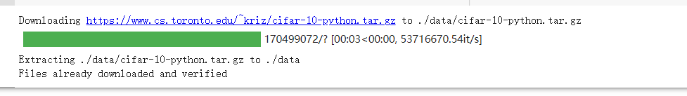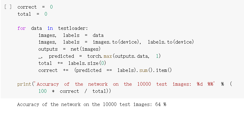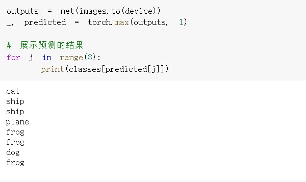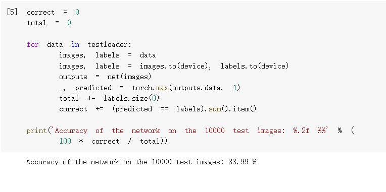 1 import torch 2 import torchvision 3 import torchvision.transforms as transforms 4 import matplotlib.pyplot as plt 5 import numpy as np 6 import torch.nn as nn 7 import torch.nn.functional as F 8 import torch.optim as optim 9 10 # 使用GPU训练,可以在菜单 "代码执行工具" -> "更改运行时类型" 里进行设置 11 device = torch.device("cuda:0" if torch.cuda.is_available() else "cpu") 12 13 transform = transforms.Compose( 14 [transforms.ToTensor(), 15 transforms.Normalize((0.5, 0.5, 0.5), (0.5, 0.5, 0.5))]) 16 17 # 注意下面代码中:训练的 shuffle 是 True,测试的 shuffle 是 false 18 # 训练时可以打乱顺序增加多样性,测试是没有必要 19 trainset = torchvision.datasets.CIFAR10(root='./data', train=True, 20 download=True, transform=transform) 21 trainloader = torch.utils.data.DataLoader(trainset, batch_size=64, 22 shuffle=True, num_workers=2) 23 24 testset = torchvision.datasets.CIFAR10(root='./data', train=False, 25 download=True, transform=transform) 26 testloader = torch.utils.data.DataLoader(testset, batch_size=8, 27 shuffle=False, num_workers=2) 28 29 classes = ('plane', 'car', 'bird', 'cat', 30 'deer', 'dog', 'frog', 'horse', 'ship', 'truck')