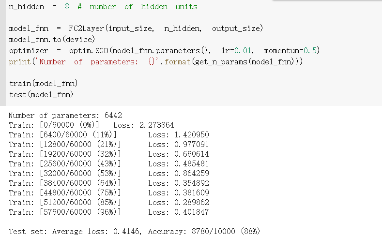 1 perm = torch.randperm(784) 2 n_hidden = 8 # number of hidden units 3 4 model_fnn = FC2Layer(input_size, n_hidden, output_size) 5 model_fnn.to(device) 6 optimizer = optim.SGD(model_fnn.parameters(), lr=0.01, momentum=0.5) 7 print('Number of parameters: {}'.format(get_n_params(model_fnn))) 8 9 train_perm(model_fnn, perm) 10 test_perm(model_fnn, perm)