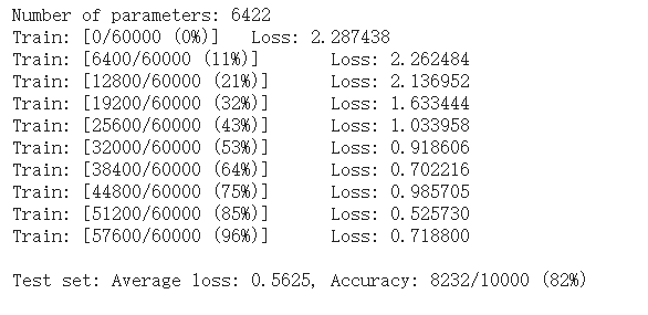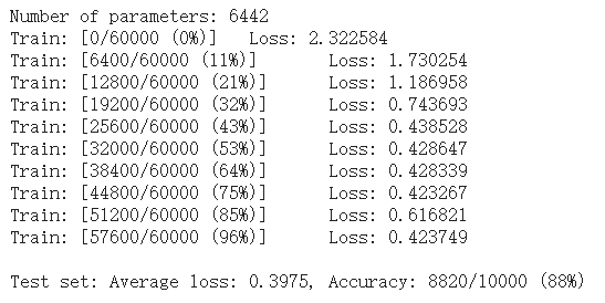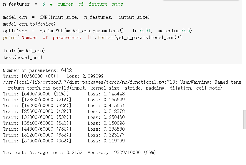 1 perm = torch.randperm(784) 2 n_features = 6 # number of feature maps 3 4 model_cnn = CNN(input_size, n_features, output_size) 5 model_cnn.to(device) 6 optimizer = optim.SGD(model_cnn.parameters(), lr=0.01, momentum=0.5) 7 print('Number of parameters: {}'.format(get_n_params(model_cnn))) 8 9 train_perm(model_cnn, perm) 10 test_perm(model_cnn, perm)