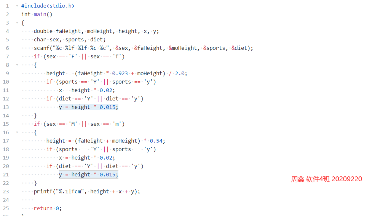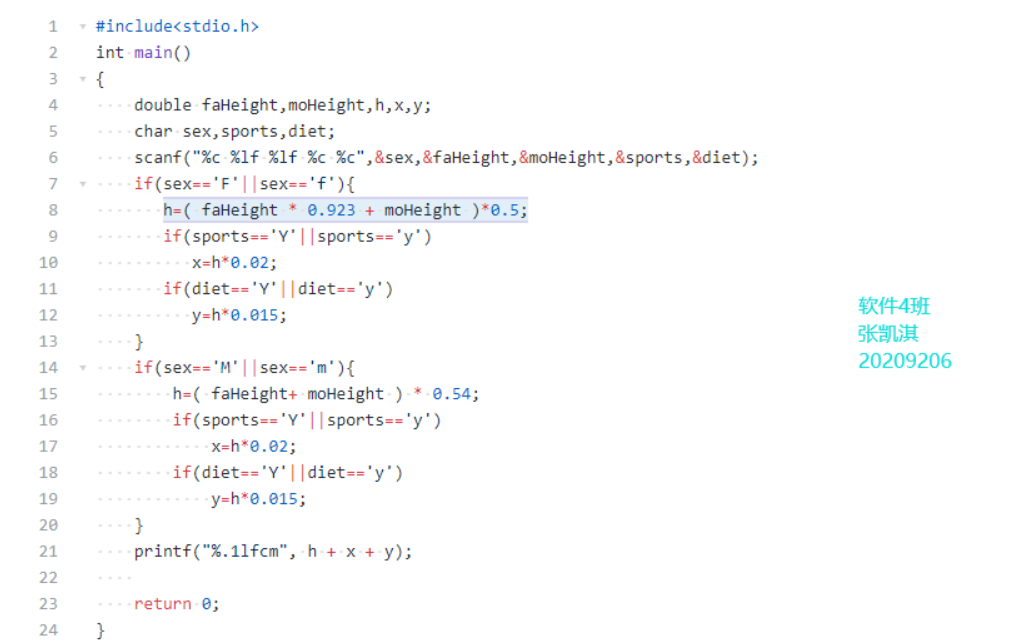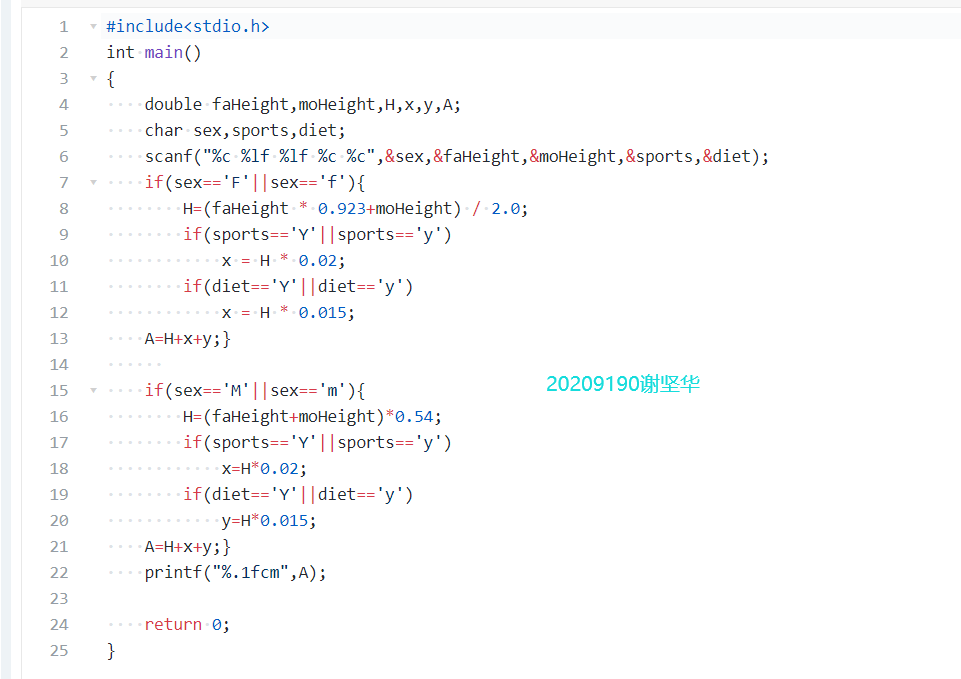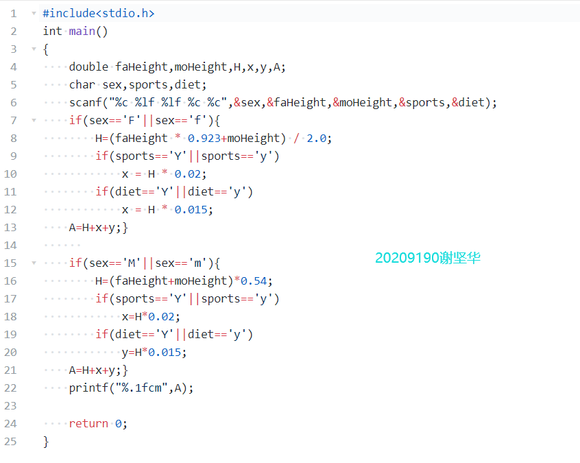 试编程从键盘输入用户的性别(用字符型变量sex存储,输入字符F或f表示女性,输入字符M或m表示男性)、父母身高(用实型变量存储,faHeight为父亲的身高,moHeight为母亲的身高)、是否喜爱体育锻炼(用字符型变量 sports存储,输入字符Y或y表示喜爱,输入字符N或n表示不喜爱)、是否有良好的饮食习惯(用字符型变量diet存储,输入字符Y或y表示良好,输人字符N或n表示不好)等条件,利用给定公式和身高预测方法对身高进行预测。