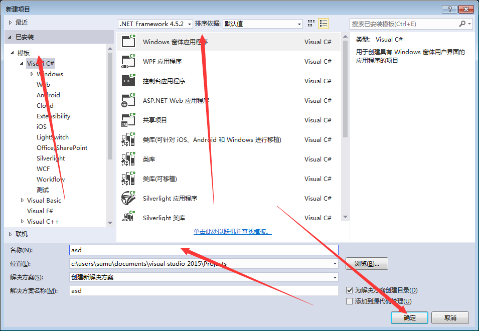 选择Windows 窗体应用程序 Visual c# 名称随意单击确定