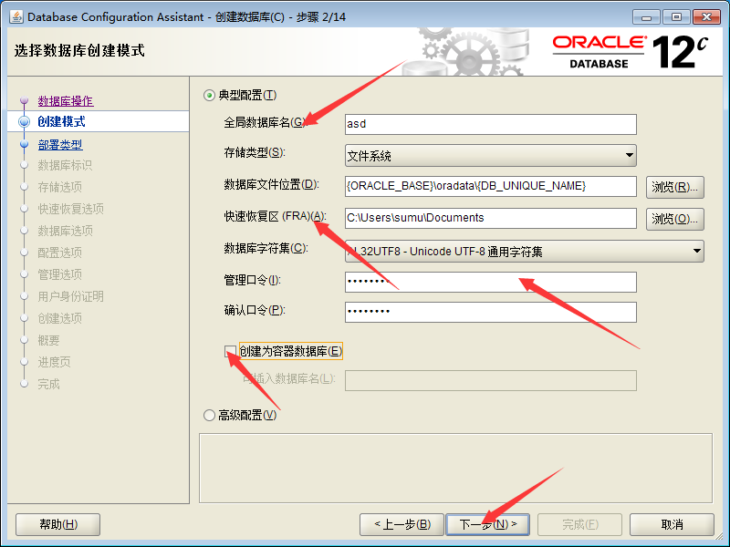 然后将开始恢复去改为c盘管理口令随意全局数据库名不能和之前的一样创建为容器数据库不勾