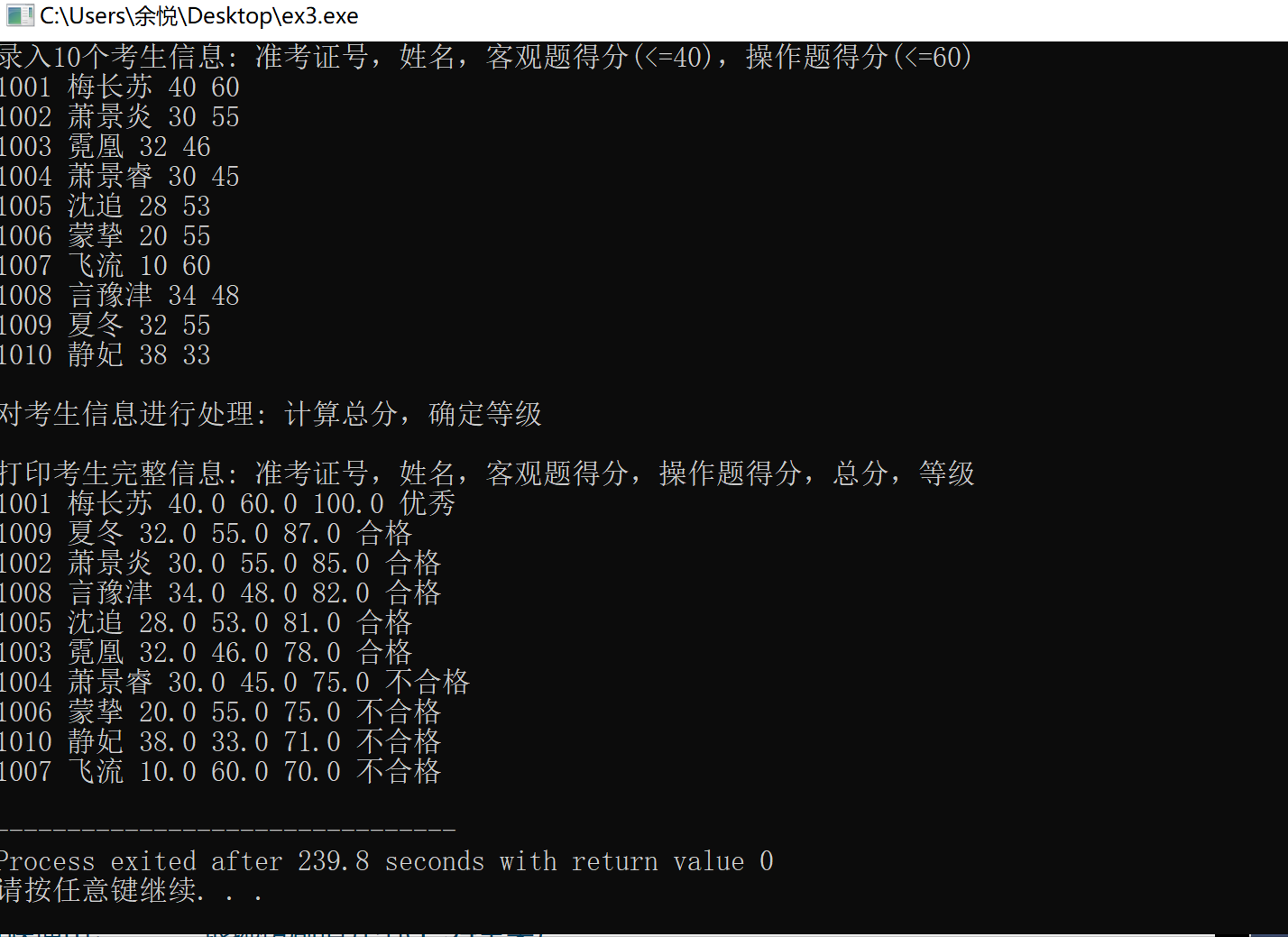 #include <stdio.h> #include <string.h> const int N = 10; // 定义结构体类型struct student,并定义其别名为STU typedef struct student { long int id; char name[20]; float objective; /*客观题得分*/ float subjective; /*操作题得分*/ float sum; char level[10]; }STU; // 函数声明 void input(STU s[], int n); void output(STU s[], int n); void process(STU s[], int n); int main() { STU stu[N]; printf("录入%d个考生信息: 准考证号,姓名,客观题得分(<=40),操作题得分(<=60)\n", N); input(stu, N); printf("\n对考生信息进行处理: 计算总分,确定等级\n"); process(stu, N); printf("\n打印考生完整信息: 准考证号,姓名,客观题得分,操作题得分,总分,等级\n"); output(stu, N); return 0; } // 录入考生信息:准考证号,姓名,客观题得分,操作题得分 void input(STU s[], int n) { // 补足代码 // ××× int i; for(i=0;i<n;i++) scanf("%ld %s %f %f",&s[i].id,&s[i].name,&s[i].objective,&s[i].subjective); } //输出考生完整信息: 准考证号,姓名,客观题得分,操作题得分,总分,等级 void output(STU s[], int n) { // 补足代码 // ××× int i; for(i=0;i<n;i++) printf("%ld %s %.1f %.1f %.1f %s\n",s[i].id,s[i].name,s[i].objective,s[i].subjective,s[i].sum,s[i].level) ; } // 对考生信息进行处理:计算总分,排序,确定等级 void process(STU s[], int n) { // 补足代码 // ××× int i,j; STU temp; for(i=0;i<n;i++) s[i].sum=s[i].objective+s[i].subjective; for(i=0;i<n-1;i++) for(j=0;j<n-i-1;j++) { if(s[j].sum<s[j+1].sum) { temp=s[j+1]; s[j+1]=s[j]; s[j]=temp; } } strcpy(s[0].level,"优秀"); for(i=1;i<=5;i++) strcpy(s[i].level,"合格"); for(i=6;i<=9;i++) strcpy(s[i].level,"不合格"); }
