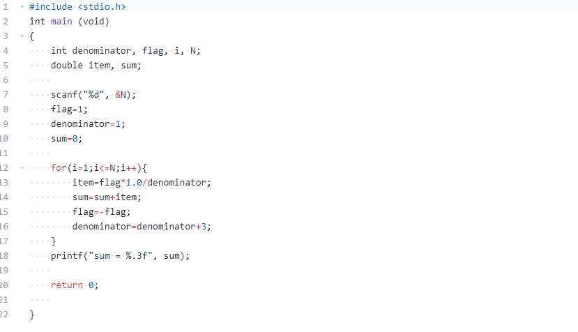 | 数据表达:变量是整型denominator, flag, i, N; 双精度浮点型item, sum; |