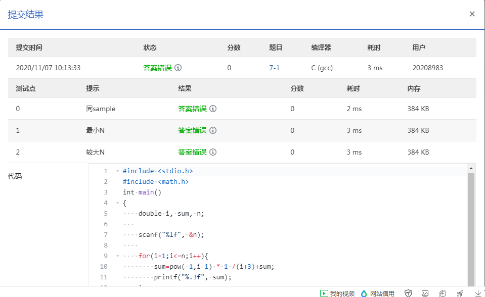 | 题目内容描述:编写程序,计算序列 1 - 1/4 + 1/7 - 1/10 + ... 的前N项之和。 |