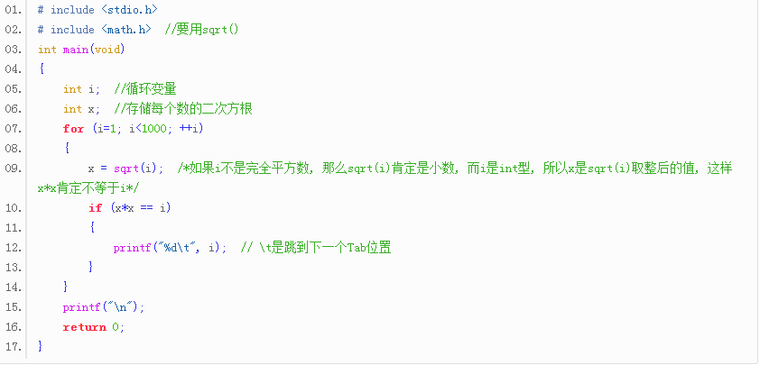 | 代码功能:输出 1~1000 之间所有的完全平方数 |