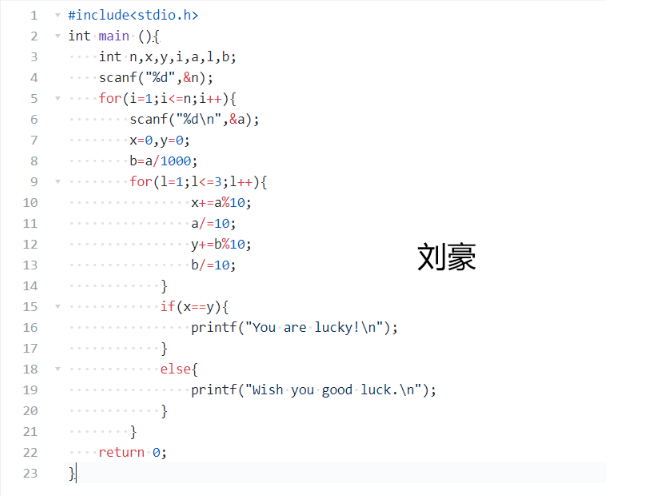 | 2 123403 234018 | Wish you good luck. You are lucky! | 输出两个数,前一个不是幸运号码,后一个为幸运号码 |