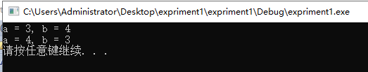 #include <stdio.h> #include <stdlib.h> int main() { int a, b, t; a = 3; b = 4; printf("a = %d, b = %d\n", a, b); t = a; a = b; b = t; printf("a = %d, b = %d\n", a, b); system("pause"); return 0; }