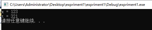 #include <stdio.h> #include <stdlib.h> int main() { int x, t, m; x = 123; printf("x = %d\n", x); t = 0; m = x % 10; t = t *10 + m; x = x / 10; m = x % 10; t = t * 10 + m; x = x / 10; m = x % 10; t = t * 10 + m; x = x / 10; printf("t = %d\n", t); system("pause"); return 0; }