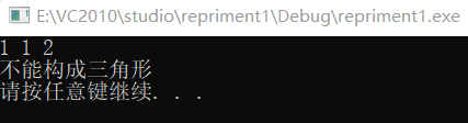#include<stdio.h> #include<stdlib.h> int main() { float a, b, c; scanf("%f%f%f", &a, &b, &c); if(a+b>c && abs(a-b)<c) printf("能构成三角形\n"); else printf("不能构成三角形\n"); system("pause"); return 0; }