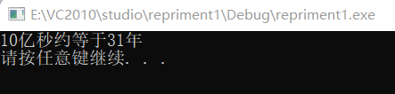 #include<stdio.h> #include<stdlib.h> int main() { int year; int s=1e9; year=s/3600/24/365; printf("10亿秒约等于%d年\n", year); system("pause"); return 0; }