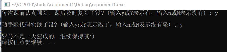 #include<stdio.h> #include<stdlib.h> int main() { char ans1, ans2; printf("每次课前认真预习、课后及时复习了没? (输入y或Y表示有,输入n或N表示没有) : "); ans1 = getchar(); getchar(); printf("\n动手敲代码实践了没? (输入y或Y表示敲了,输入n或N表示没有敲) : "); ans2 = getchar(); if((ans1 == 'y' || ans1 == 'Y') && (ans2 == 'y' || ans2 == 'Y')) printf("\n罗马不是一天建成的, 继续保持哦:)\n"); else printf("\n罗马不是一天毁灭的, 我们来建设吧\n"); system("pause"); return 0; }