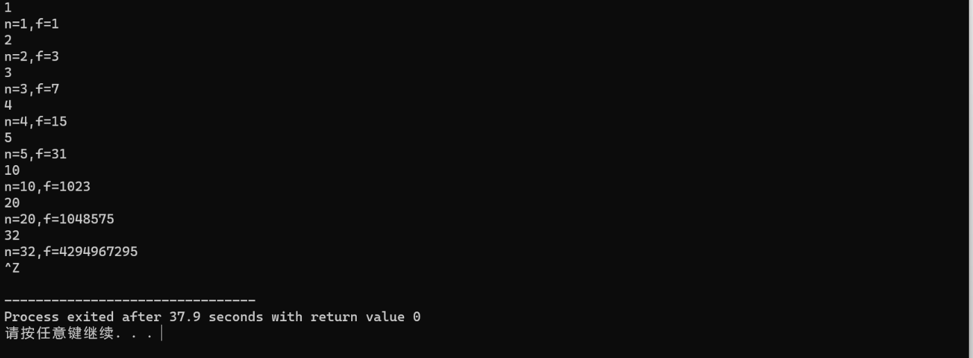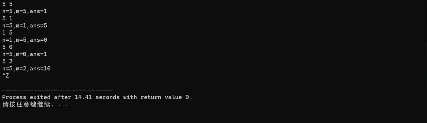 printf("n=%d,m=%d,ans=%d\n",n,m,func(n,m));
