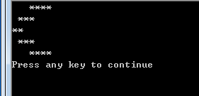 #include<stdio.h> main() { printf(" ****\n"); printf(" ***\n"); printf("**\n"); printf(" ***\n"); printf(" ****\n"); }