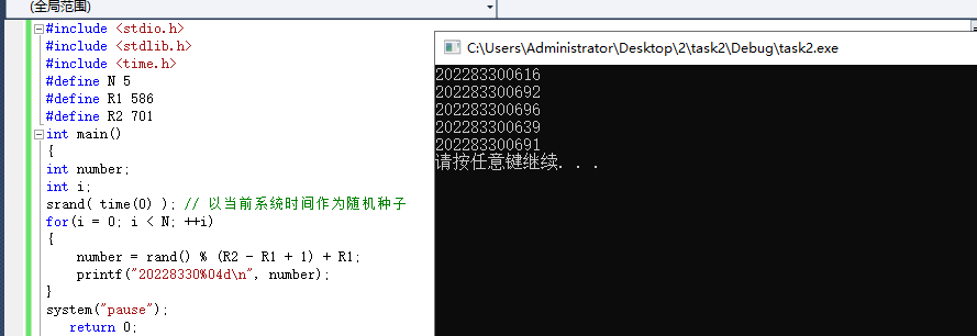 #include <stdio.h> #include <stdlib.h> #include <time.h> #define N 5 #define R1 586 #define R2 701 int main() { int number; int i; srand( time(0) ); for(i = 0; i < N; ++i) { number = rand() % (R2 - R1 + 1) + R1; printf("20228330%04d\n", number); } system("pause"); return 0; }