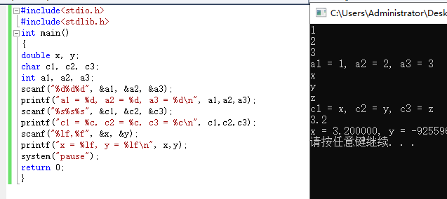 #include<stdio.h> #include<stdlib.h> int main() { double x, y; char c1, c2, c3; int a1, a2, a3; scanf("%d%d%d", &a1, &a2, &a3); printf("a1 = %d, a2 = %d, a3 = %d\n", a1,a2,a3); scanf("%s%s%s", &c1, &c2, &c3); printf("c1 = %c, c2 = %c, c3 = %c\n", c1,c2,c3); scanf("%lf,%f", &x, &y); printf("x = %lf, y = %lf\n", x,y); system("pause"); return 0; }
