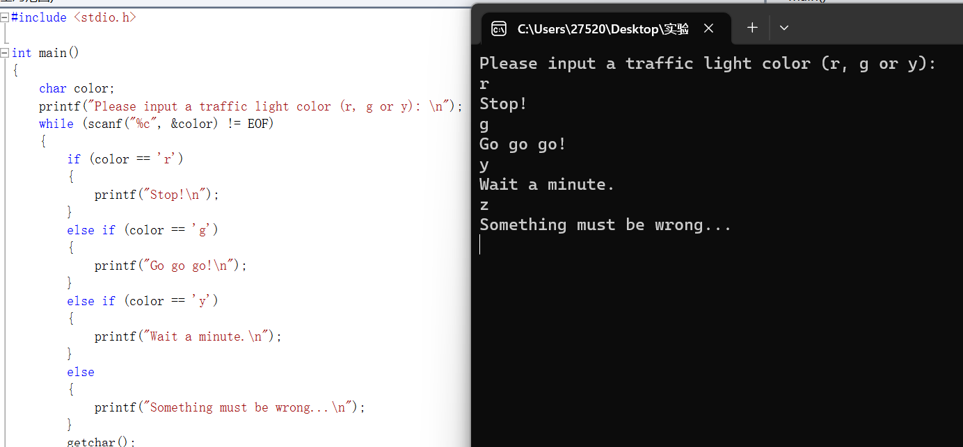 #include <stdio.h> int main() { char color; printf("Please input a traffic light color (r, g or y): \n"); while (scanf("%c", &color) != EOF) { if (color == 'r') { printf("Stop!\n"); } else if (color == 'g') { printf("Go go go!\n"); } else if (color == 'y') { printf("Wait a minute.\n"); } else { printf("Something must be wrong...\n"); } getchar(); } return 0; }