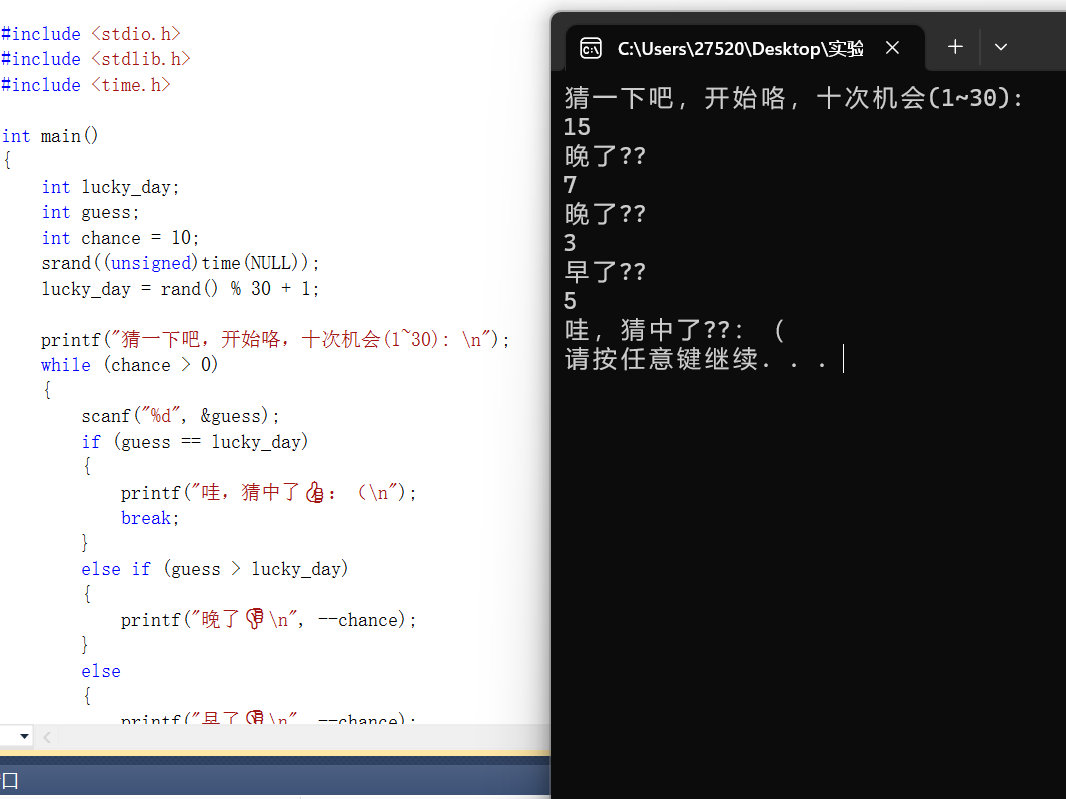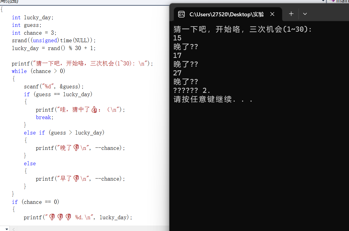 #include <stdio.h> #include <stdlib.h> #include <time.h> int main() { int lucky_day; int guess; int chance = 3; srand((unsigned)time(NULL)); lucky_day = rand() % 30 + 1; printf("猜一下吧,开始咯,三次机会(1~30): \n"); while (chance > 0) { scanf("%d", &guess); if (guess == lucky_day) { printf("哇,猜中了👍:(\n"); break; } else if (guess > lucky_day) { printf("晚了👎\n", --chance); } else { printf("早了👎\n", --chance); } } if (chance == 0) { printf("👎👎👎 %d.\n", lucky_day); } system("pause"); return 0; }