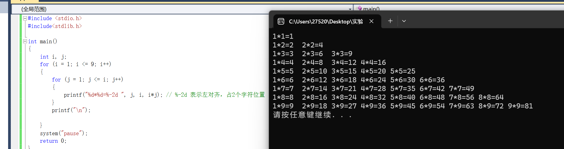 #include <stdio.h> #include<stdlib.h> int main() { int i, j; for (i = 1; i <= 9; i++) { for (j = 1; j <= i; j++) { printf("%d*%d=%-2d ", j, i, i*j); // %-2d 表示左对齐,占2个字符位置 } printf("\n"); } system("pause"); return 0; }