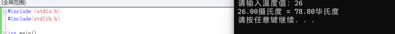 #include <stdio.h> #include<stdlib.h> int main() { float temp; float result; printf("请输入温度值:"); scanf("%f", &temp); result = temp * 1.8 + 32; printf("%.2f摄氏度 = %.2f华氏度\n", temp, result); system("pause"); return 0; }