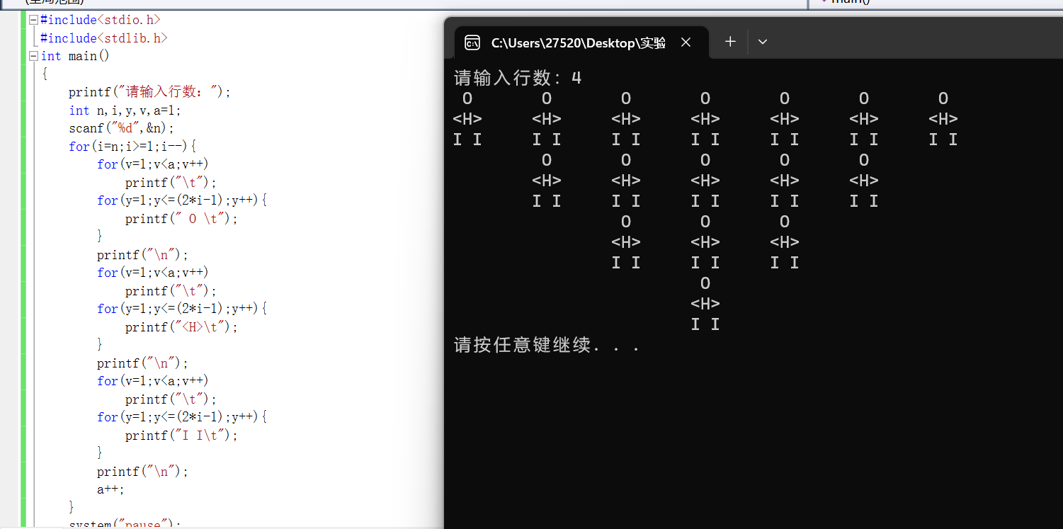 #include<stdio.h> #include<stdlib.h> int main() { printf("请输入行数:"); int n,i,y,v,a=1; scanf("%d",&n); for(i=n;i>=1;i--){ for(v=1;v<a;v++) printf("\t"); for(y=1;y<=(2*i-1);y++){ printf(" O \t"); } printf("\n"); for(v=1;v<a;v++) printf("\t"); for(y=1;y<=(2*i-1);y++){ printf("<H>\t"); } printf("\n"); for(v=1;v<a;v++) printf("\t"); for(y=1;y<=(2*i-1);y++){ printf("I I\t"); } printf("\n"); a++; } system("pause"); return 0; }