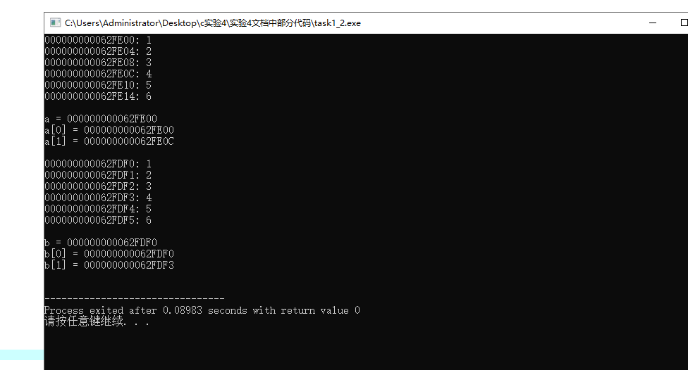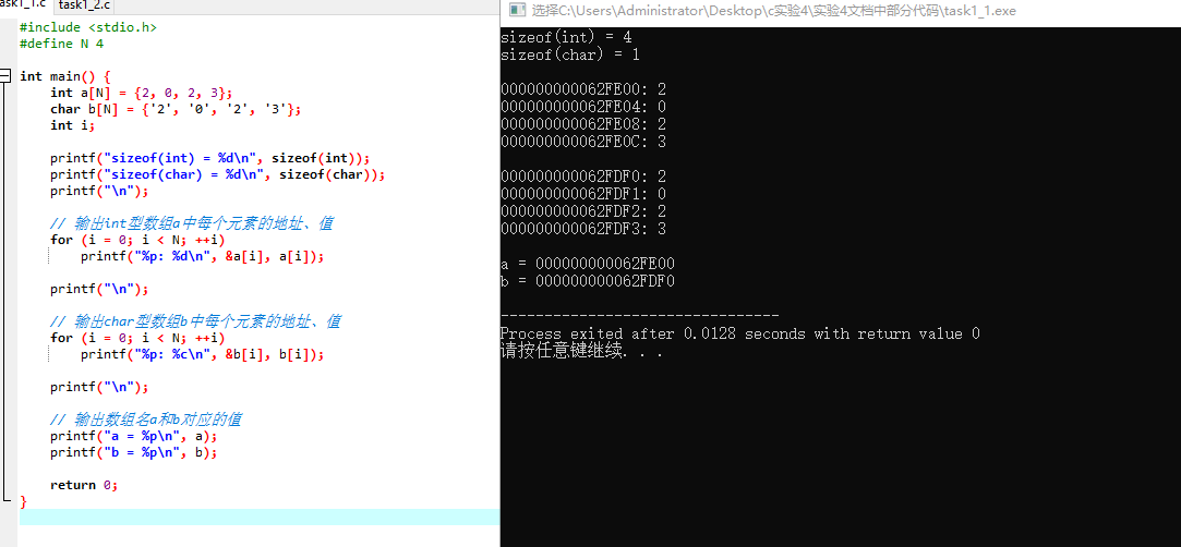 #include <stdio.h> #define N 4 int main() { int a[N] = {2, 0, 2, 3}; char b[N] = {'2', '0', '2', '3'}; int i; printf("sizeof(int) = %d\n", sizeof(int)); printf("sizeof(char) = %d\n", sizeof(char)); printf("\n"); // 输出int型数组a中每个元素的地址、值 for (i = 0; i < N; ++i) printf("%p: %d\n", &a[i], a[i]); printf("\n"); // 输出char型数组b中每个元素的地址、值 for (i = 0; i < N; ++i) printf("%p: %c\n", &b[i], b[i]); printf("\n"); // 输出数组名a和b对应的值 printf("a = %p\n", a); printf("b = %p\n", b); return 0; }